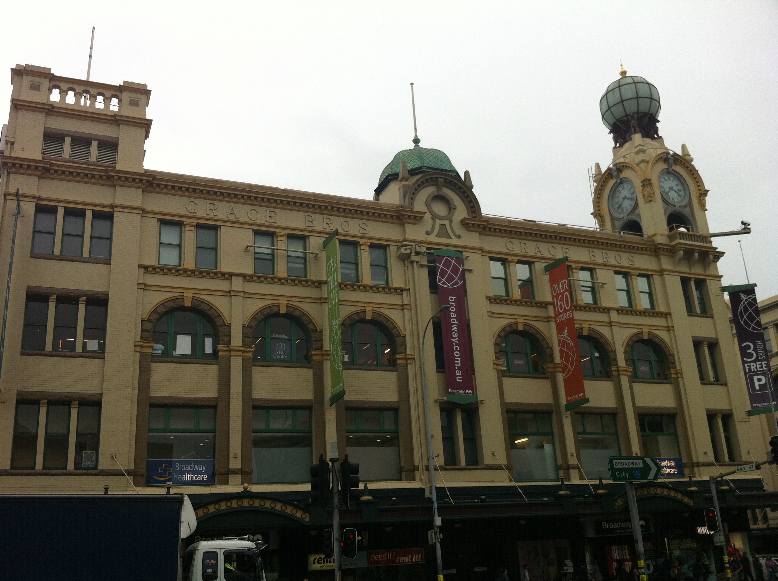 In 1903, Albert and Joseph Grace established their flagship shop (flagshop?), ‘The Model Store’, in an 1896-built four-storey building on what was then George Street West (now Broadway). Dudes even constructed a private electricity plant to power the store. It took another 20 years before the twin store across Bay Street was built. In 1911, a theatre was constructed beneath the original building. Queen Elizabeth II visited the store in 1954. Grace Bros. set up their own removalist service from this building, now known as Grace Removals. The domes above the clocks were filled with water that operated the building’s hydraulic lifts.