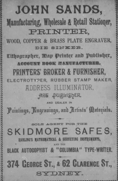 As you can see, John and the other Sands made a living sinking dies, engraving plates and printing all manner of stationery. Someone was canny enough to have engraved the business name all over this building too, because now it’s heritage listed. Despite the listing, it’s currently for lease, despite plans in recent years to convert it into an Italian restaurant and a Nando’s chicken shop, among other things. To survive a Nando’s incursion…that’s staying power. I guess you might say [Terrible sand erosion pun removed for everybody’s sake – Ed].