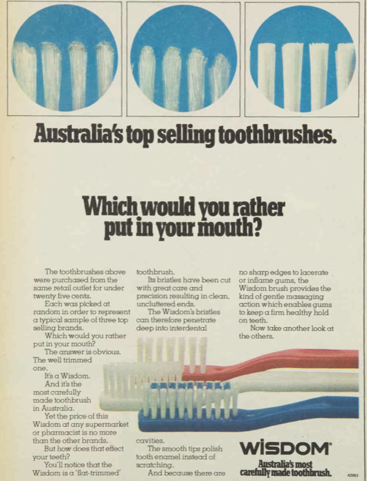By the 1970s Wisdom was flush with cash, taking out boastful ads in magazines and adding the company’s logo and a giant toothbrush to the side of the factory, which is a practice that really needs to come back in fashion.