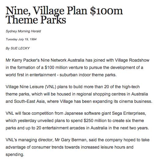 I think that last paragraph is the most revealing: “the company hoped to take advantage” of consumers. As the article says, Packer and Village’s unholy union resulted in Village Nine Leisure, a concept so insanely commercial it could only have existed in the 90s. In Packer’s signature extravagant style, VNL wasn’t just going to run some ratty arcades with Daryl Somers cutting the ribbon – these were going to be suburban indoor theme parks. As VNL managing director Gary Berman puts it,