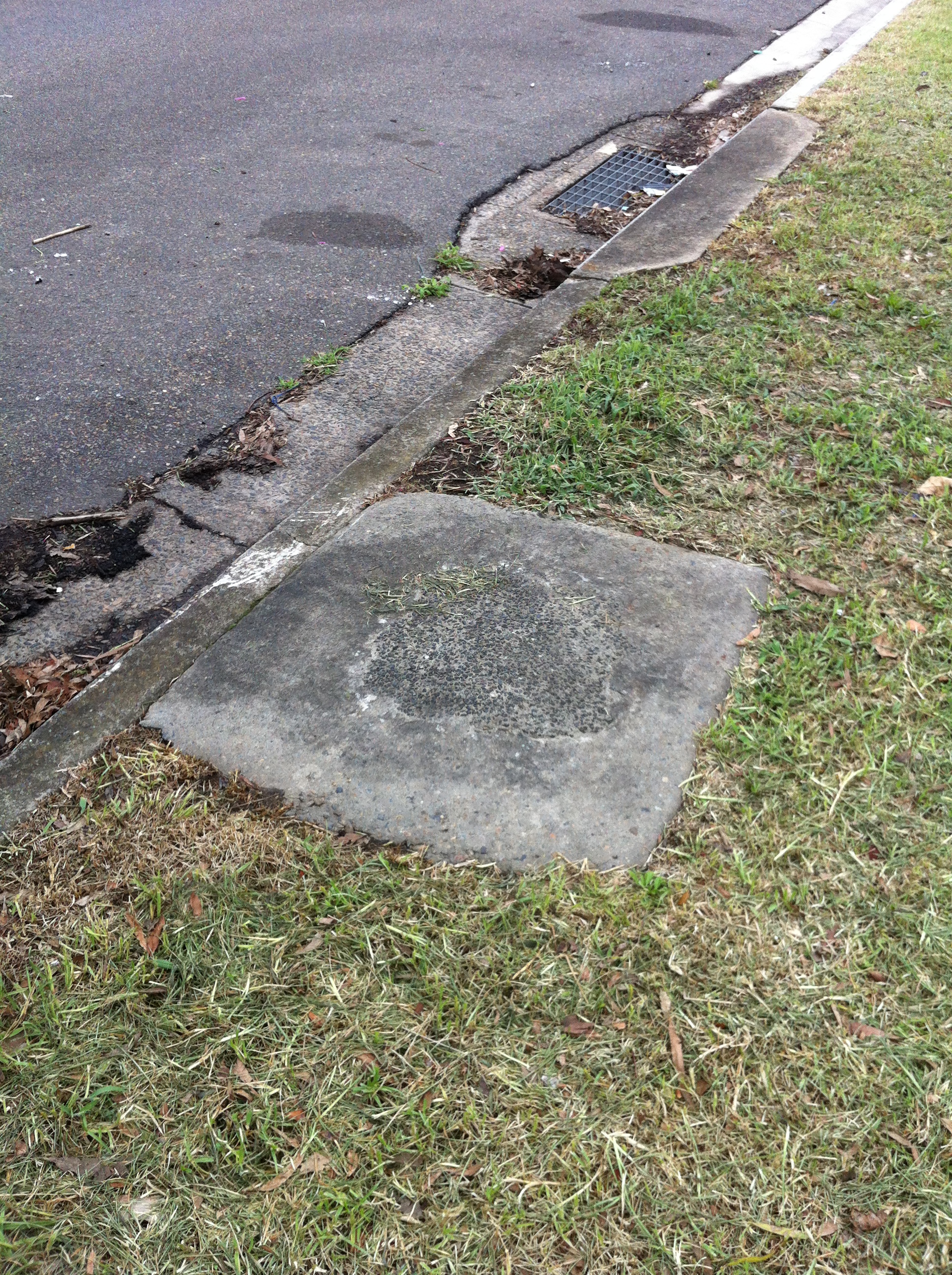 The kerb is clearly a lighter shade of cement, indicating the spot where the driveway used to be. The two bushes are doing a laughable job of hiding the wooden fencing that blocks off those driveways.