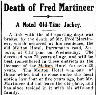 …the public was swept up by a need to reinstill a sense of public decency via a series of local option acts. The acts enforced a six o’clock closing time for pubs and resulted in 293 hoteliers losing their licenses, including Martineer. Despite the pub’s closure and with flagrant disregard to the after hours prohibition, he continued to live in what became known as the ‘old Melton Hotel’ until his death in 1918: