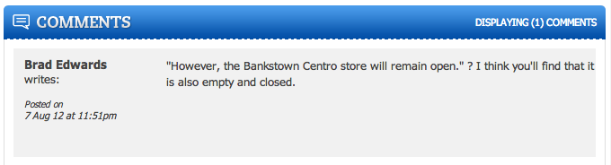 According to this article on the store’s closure, Darrell Lea admin chose to close Roselands (looks like I’ve met my assonance quota for the day), yet kept the Bankstown Centro store open. But commenter Brad Edwards reveals the truth:
