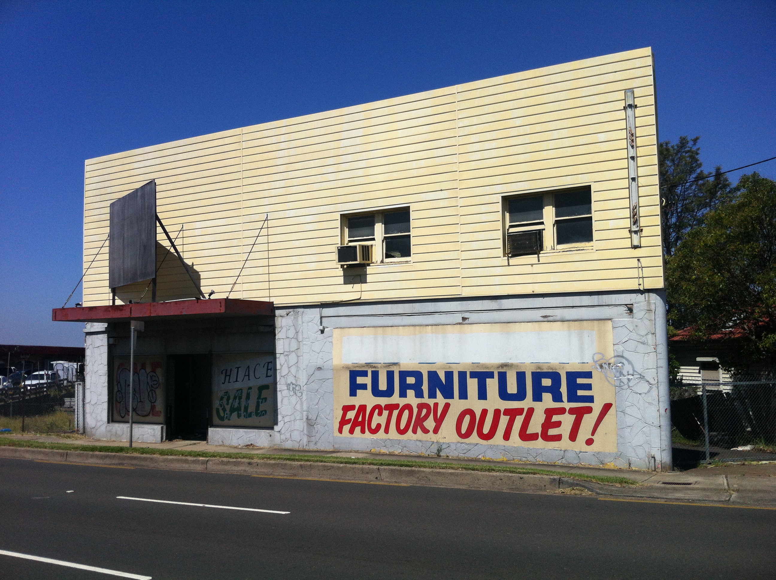 From the look of things, a furniture factory outlet took charge of the prominent location and eye-grabbing paint job before (in a cruel parody of the corporate 80s) it was absorbed by the Japanese Car Centre. And now that’s been gone for years, so who’s here now?