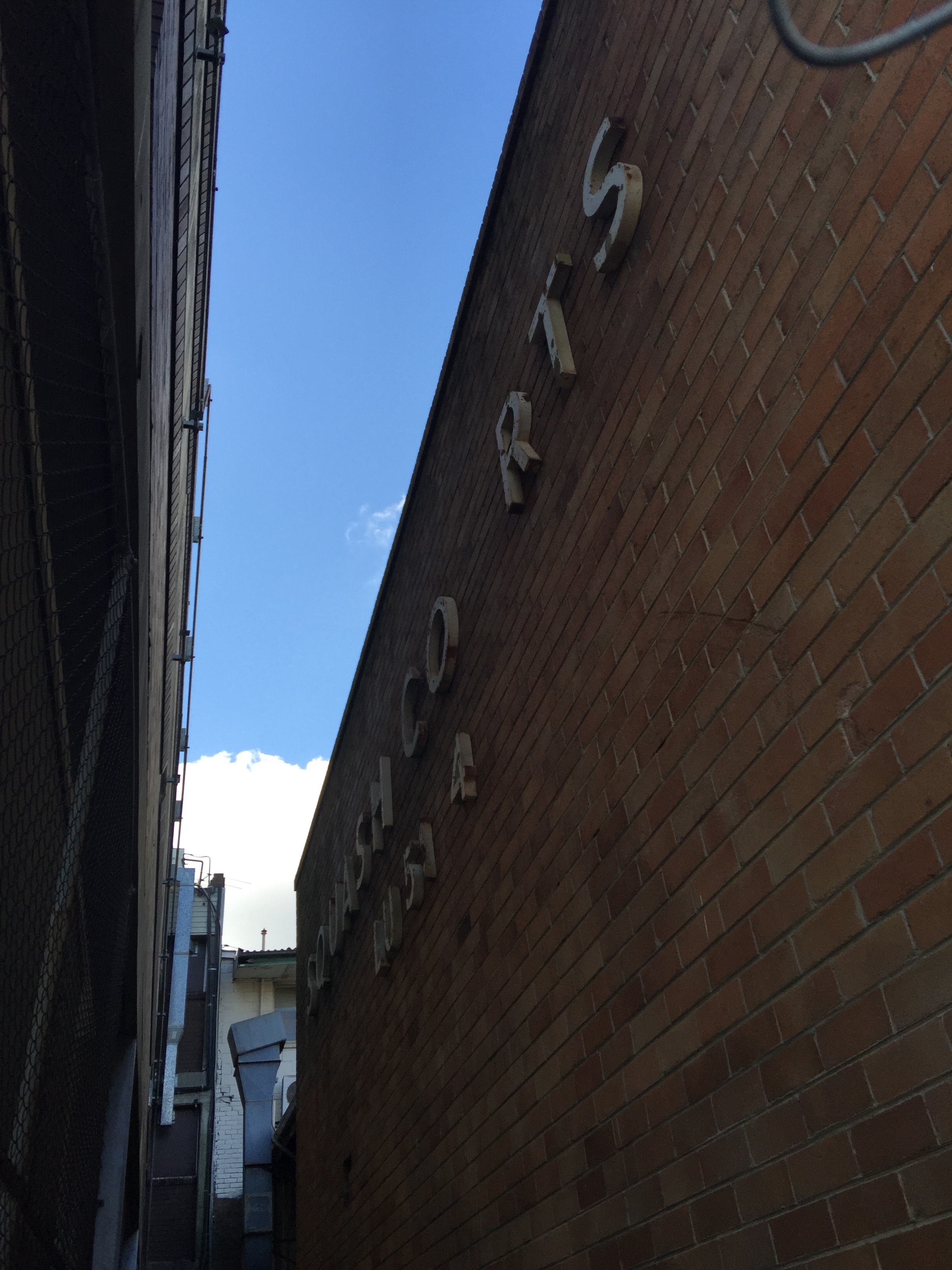 This photo, taken from what is now a car park across the road, shows that the Beverly Hills Hotel was once called the Hotel Bennelong, that there was some kind of Coke-sponsored diner next door to it, and oh, what’s that tall sign on the far left? I can’t quite read it. And if you think the BHH is rough these days, imagine how it must have been back then. There’s a reason those guys are wearing hard hats.