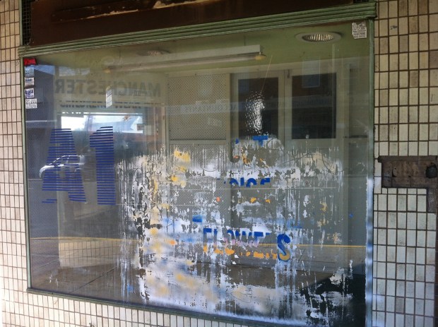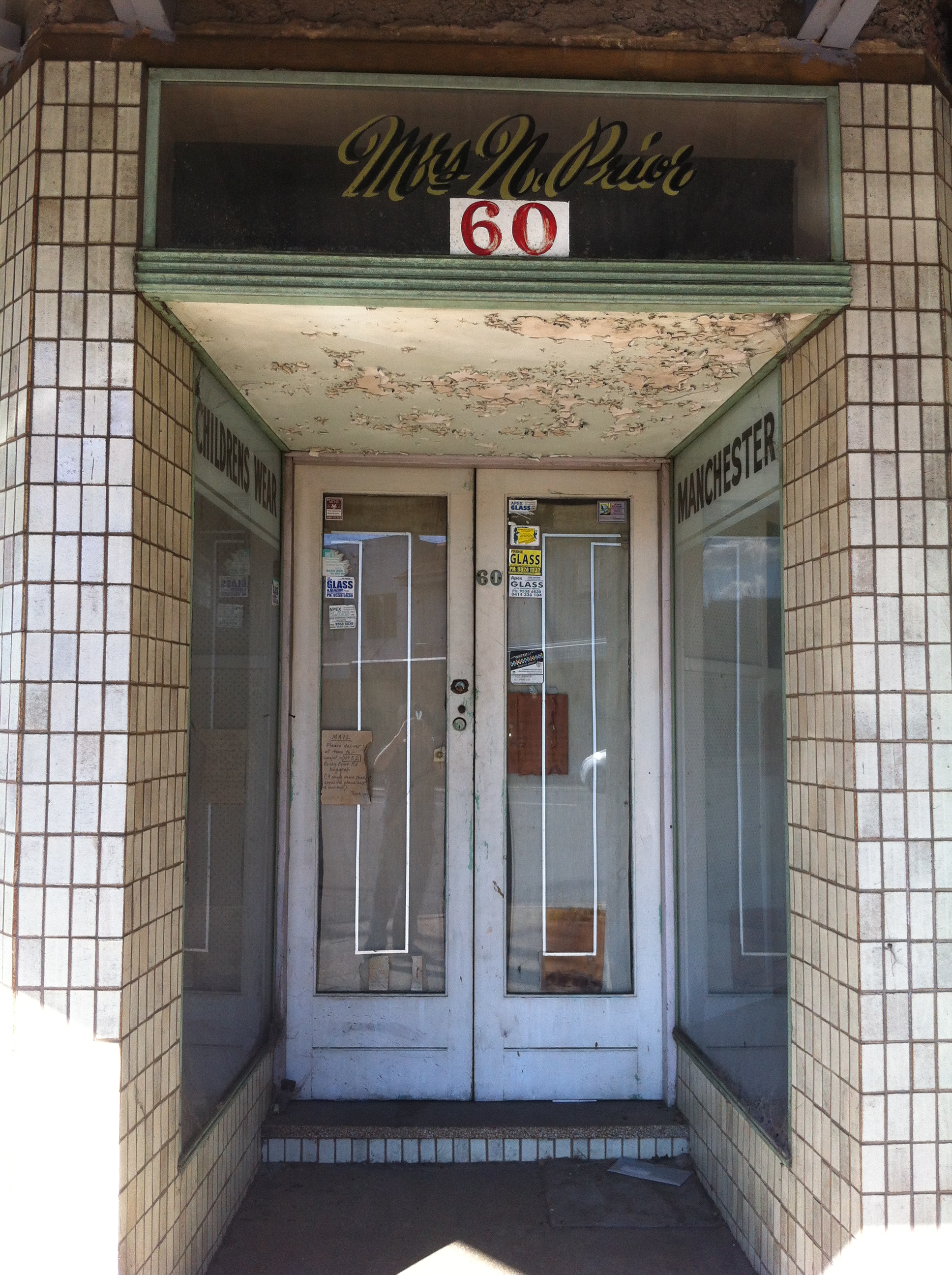 The biggest, boldest sign yet sits above the doorway. The Ladies Clothing sign has been halfheartedly spraypainted over. A sign sits in the front window – it reads ‘ASSISTANT WANTED’.
