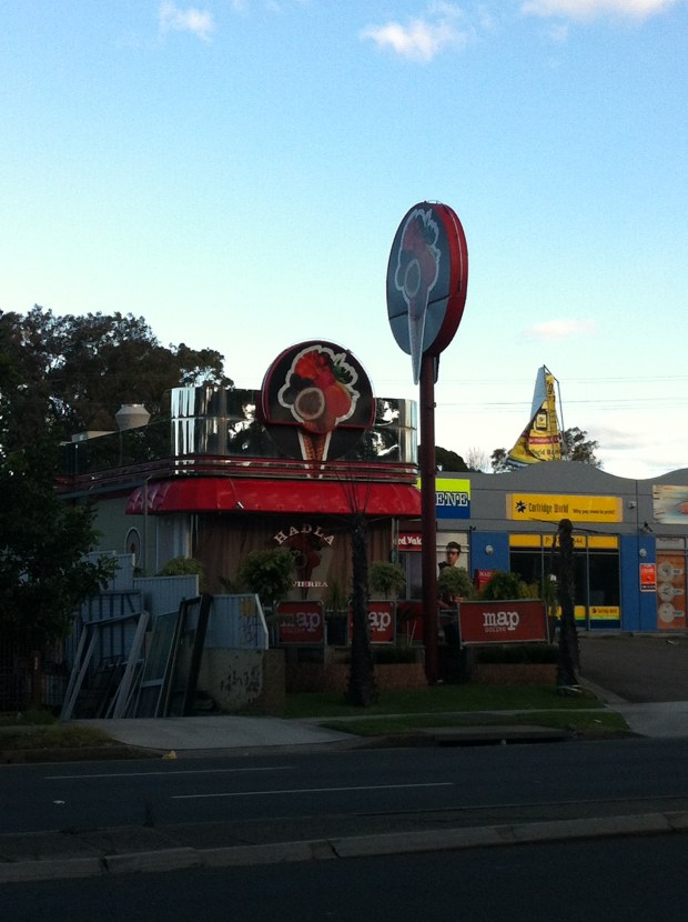 Let’s go back to the early 1990s, when someone had a bright idea: ‘How about a series of 50s-style Americana-filled burger restaurants…in Sydney!’ If that sounds stupid, that’s because it is. Hungry Jacks had been trying for years to evoke thatHappy Days flavour, but it just wasn’t washing with the Whopper-eating public. HJ has quietly phased out the Americana over the last ten years, but it’s not uncommon to walk in and find pictures of Elvis and Marilyn adorning the walls, a jukebox in the corner and fries so stale they could only be from 1958. The mastermind behind Route 66 had clearly decided that HJ wasn’t going far enough, and launched the above restaurant at Revesby around 1994. It wasn’t some Mickey Mouse venture, either – there were TV ads imploring hungry viewers to ‘get their kicks’. Within the impressively chromed exterior, girls in miniskirts served up grilled burgers, fries and shakes to patrons amid 50s tunes and checkered floors, while outside the owners hoped to recreate the burger joint atmosphere by providing plenty of parking and a drive-thru service. By all accounts the burgers weren’t bad, but one of the many mistakes the owners made was setting up shop across the road from an infinitely more accessible McDonald’s. Route 66 sits along Canterbury Road, with customers forced to enter and exit via the busy thoroughfare. The customers didn’t take long to work out that it was easier to get into the McDonald’s, and by 2000 the Route 66 dream was over. There were a few Route 66 locations beside this one, but I’m not sure whether they were all part of the same franchise or not. Prestons featured a notorious Route 66 for many years, where hoons really did congregate en masse, much to residents’ discontent.