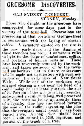 Finally, here’s a fascinating account of a visit to Devonshire Street Cemetery just as its demolition was beginning. It originally appeared in the Clarence and Richmond Examiner, October 1 1901.