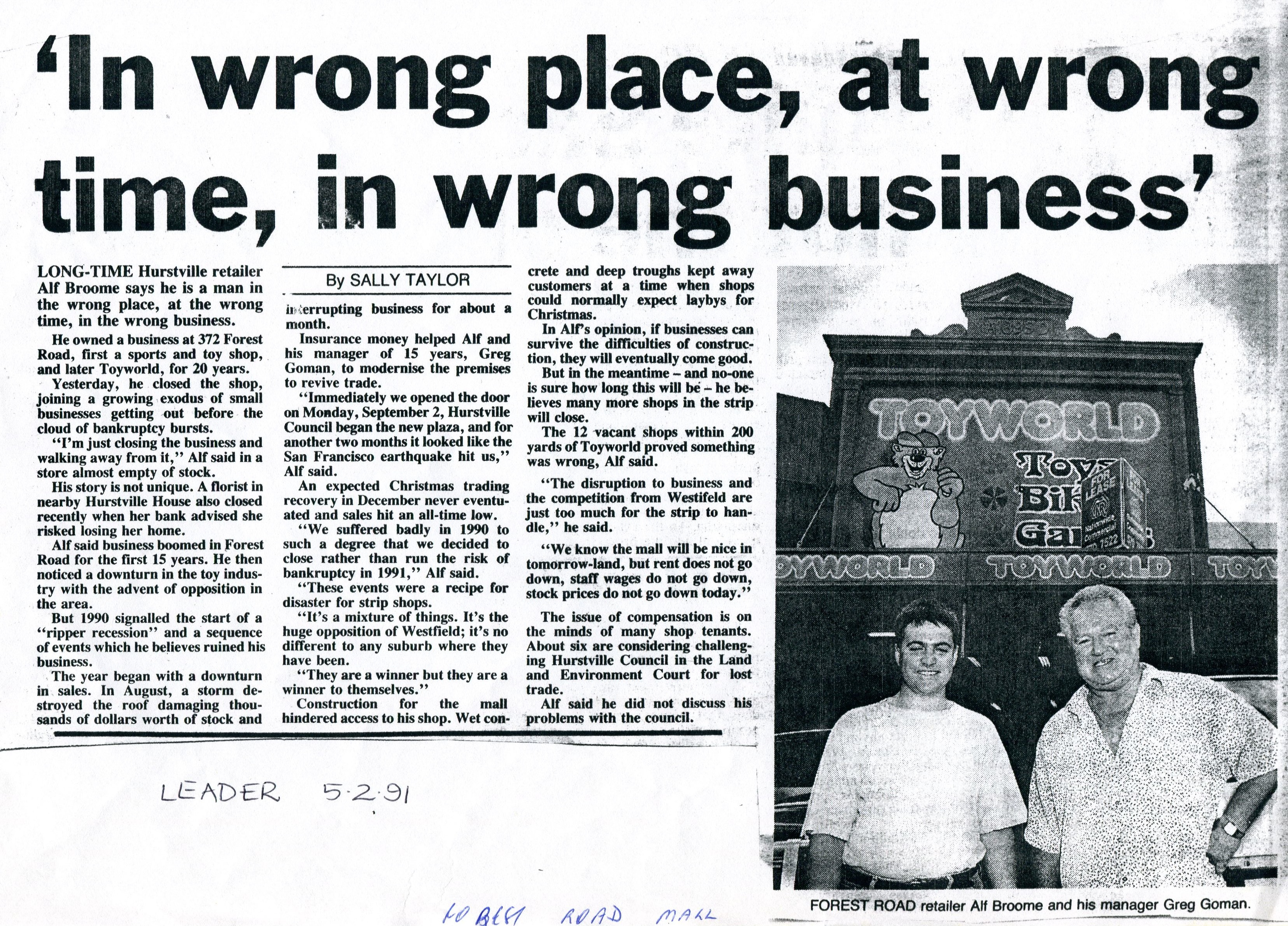 Then, as Broome puts it, a “ripper recession” devastated any chance of recovery in 1990, with severe storm damage that same year not helping matters. Another strange point of impact upon sales mentioned by Broome was construction of a ‘new plaza’ by local council. Hmm…I’ll have to look into that one.